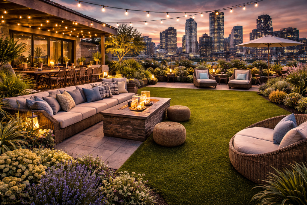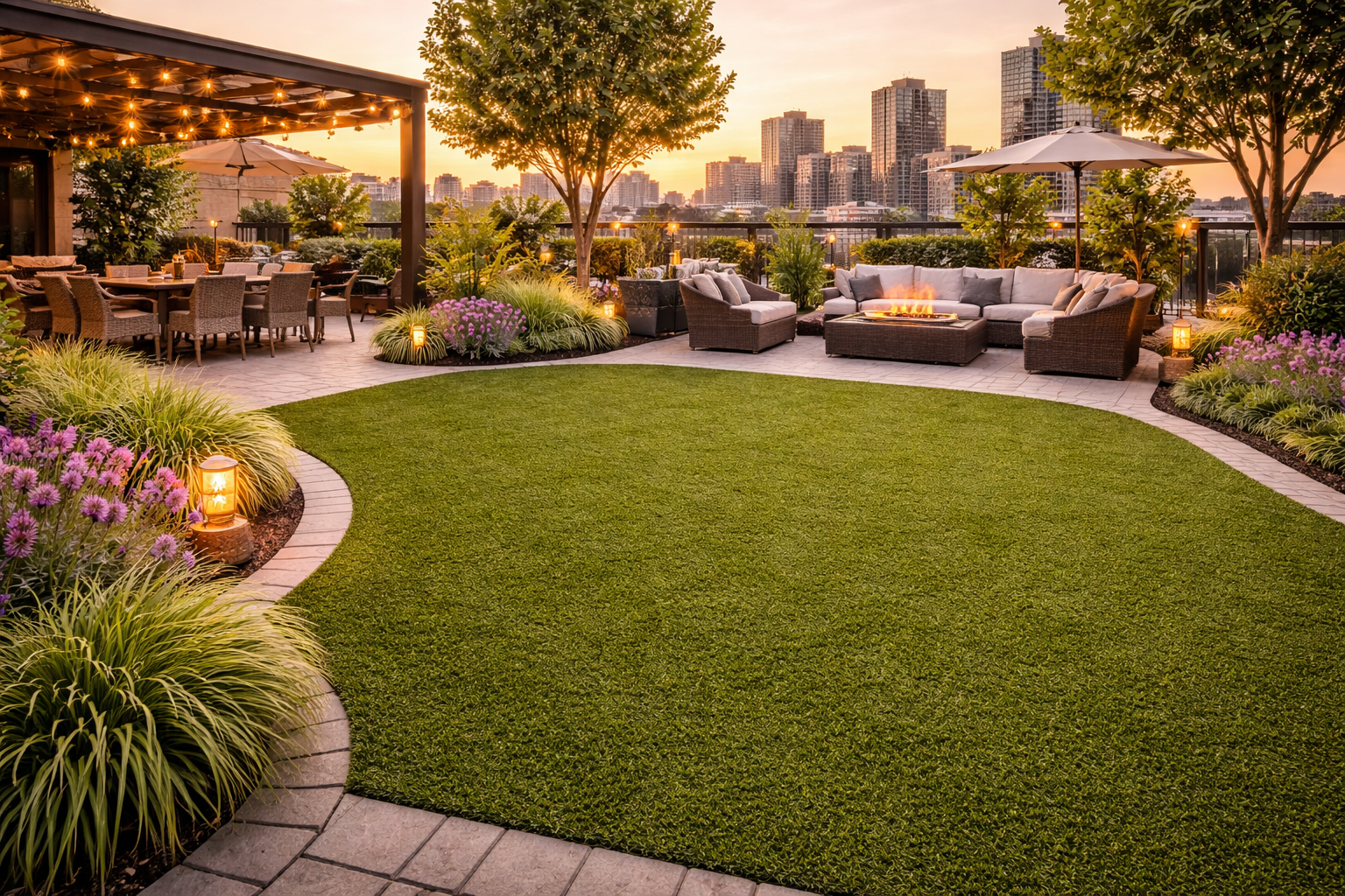 Add greenery to apartment balconies or rooftop spaces using comfortable synthetic turf surfaces.