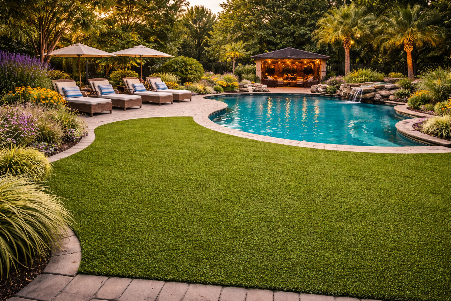 Synthetic grass adds a natural look while offering slip-resistant comfort around swimming pools.