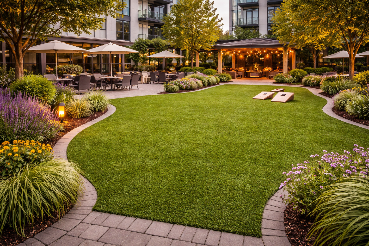 Restaurants, offices, and retail spaces use artificial turf to create inviting outdoor environments that require minimal maintenance.